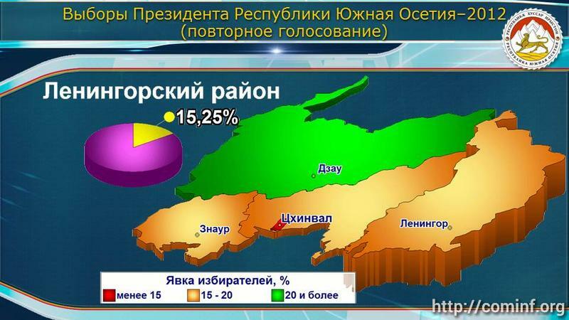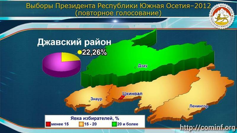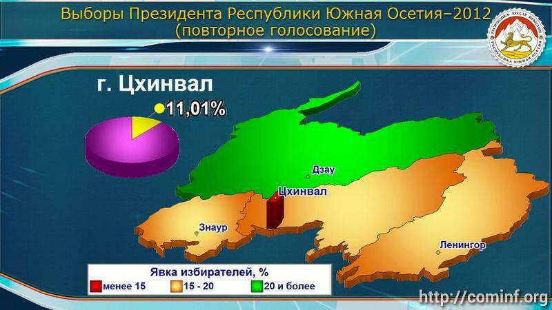 По ее словам, на избирательных участках в Дзауском районе Южной Осетии проголосовало 22,26%, в Знаурском районе РЮО — 16,40%, в Ленингорском районе — 15,25%, в Цхинвальском районе — 15,84% и в самом городе Цхинвале — 11,01% избирателей.