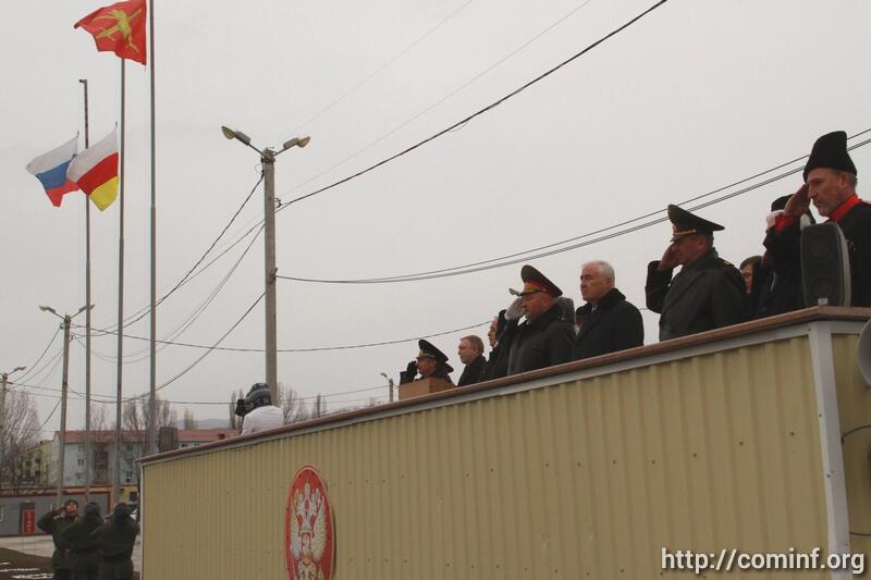 В расположении Цхинвальского гарнизона 4-ой российской военной базы состоялось торжественное построение личного состава части в честь отмечаемого сегодня Дня защитника Отечества. На мероприятие были приглашены представители руководства Южной Осетии во главе с президентом Леонидом Тибиловым, а также делегации Министерства обороны Абхазии и Кубанского казачьего войска, прибывших в Республику для участия в праздничных мероприятиях, посвященных 20-летию образования Министерства обороны РЮО (22 февраля) и Дню защитника Отечества.