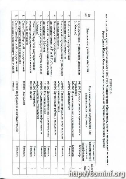 Межведомственная рабочая группа по проведению отбора кандидатов на обучение в Российские вузы в 2013-2014 гг.. информирует, что в здании Министерства образования и науки РЮО (г. Цхинвал. ул, Октябрьская,д.74, каб.201) проводиться до 14 мая с.г. (кроме праздничных и выходных дней) прием документов на целевые места в вузы РФ на 2013 год.