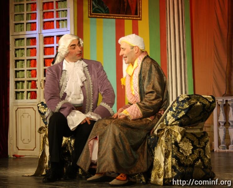 Несомненно, все образы, созданные на сцене лучшими актерами театра были ярки, выразительны, игривы – комедийные постановки нашими актерами всегда исполнялись с завидным совершенством. В то же время хочется выделить несколько удачных воплощений. Роль мещанина господина Журдена блестяще сыграл заслуженный артист Южной Осетии Георгий Багаев. Высокомерный француз в его исполнении был неотразим и оставил в сердцах зрителей много незабываемых впечатлений. С игрой главного героя гармонично перекликалась, исполненная актрисой Жанной Догузовой яркая, динамичная и искрящаяся энергией роль госпожи Журден.