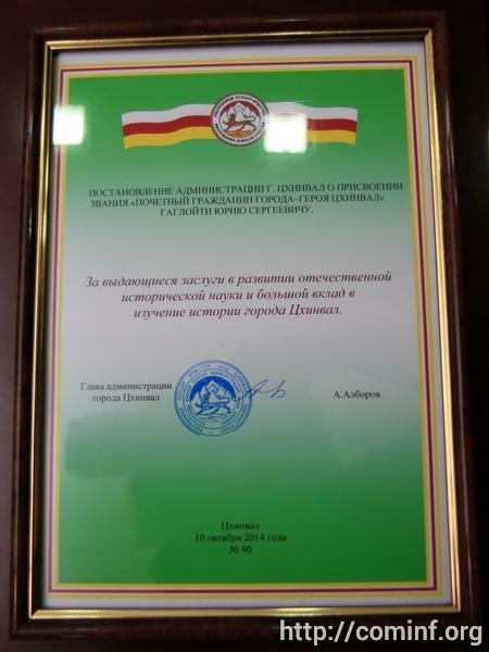 За выдающиеся заслуги в развитии отечественной исторической науки и большой вклад в изучение истории столицы Южной Осетии Глава Администрации города Цхинвал Алан Алборов вручил Юрию Гаглойты свидетельство о присвоении звания «Почетный гражданин Города-героя Цхинвал».