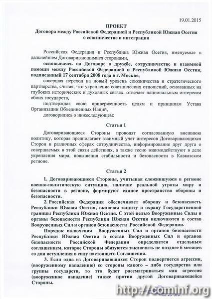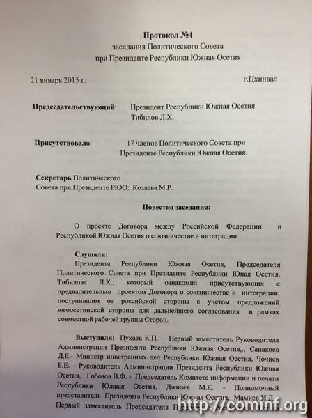 21 января 2015 года состоялось очередное заседание Политического Совета при Президенте РЮО, на котором обсуждены вопросы дальнейшей работы по разработке проекта Договора между Российской Федерацией и Республикой Южная Осетия о союзничестве и интеграции.