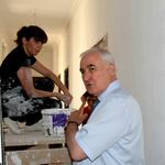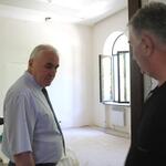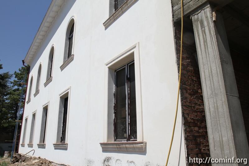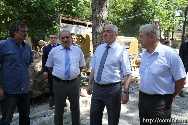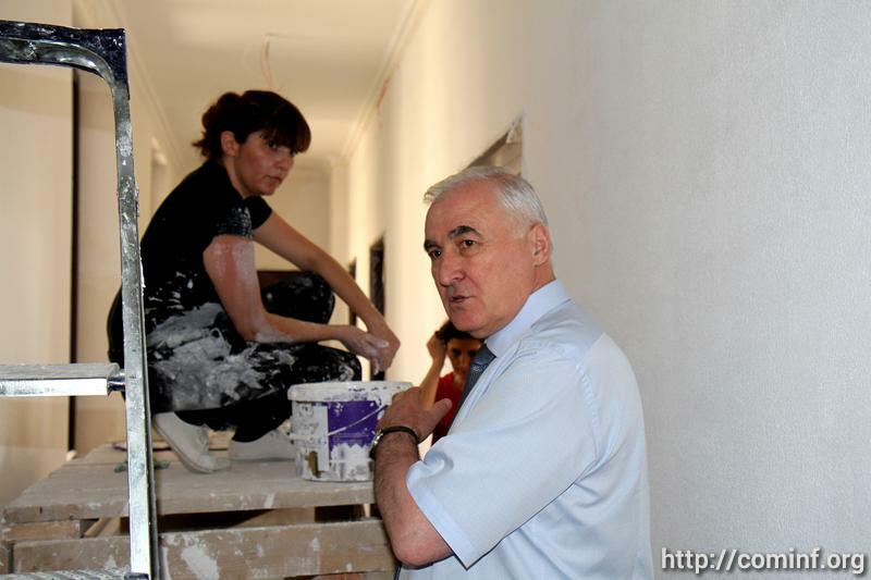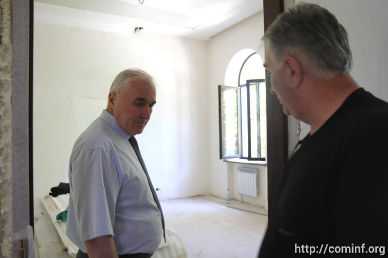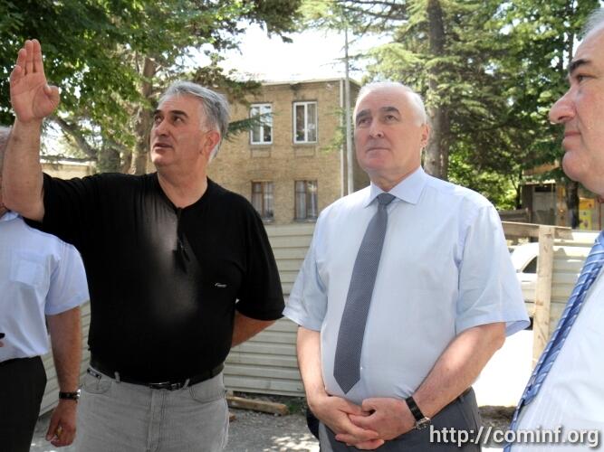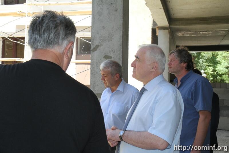 В ходе осмотра здания сопровождающий Леонида Тибилова министр строительства, архитектуры и ЖКХ РЮО Эдуард Дзагоев доложил, что объемы работ в основном корпусе, где будет располагаться президент и часть работников администрации, выполнены на 80%.