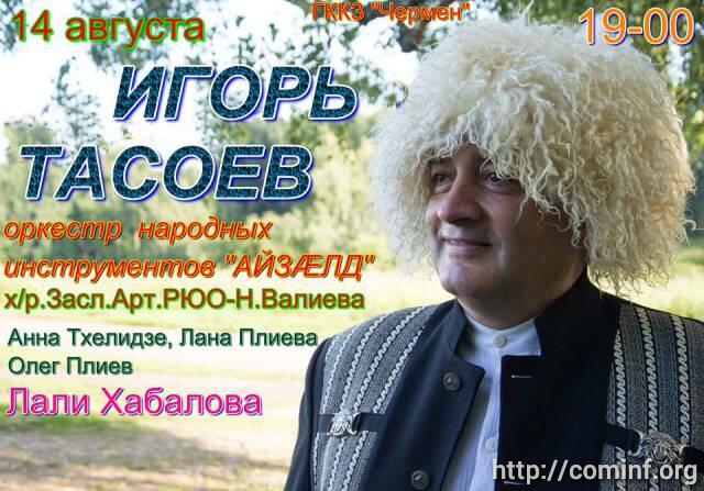 В Государственном киноконцертном зале «Чермен» 14 августа при поддержке Министерства культуры РЮО состоится сольный концерт певца Игоря Тасоева.