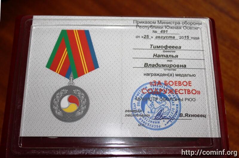 В Фонде защиты раненых, ставших инвалидами в ходе боевых действий на территории РЮО в 1989-2008 годах, прошла церемония награждения защитников республики медалями Министерства обороны Южной Осетии. В церемонии награждения также приняли участие председатель Северо-Осетинского регионального отделения организации «Инвалиды войны в Афганистане» Виталий Джаджиев, заместитель председателя Наталья Тимофеева, воины афганцы из Северной Осетии.