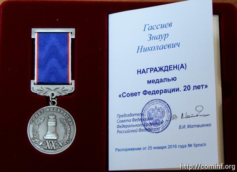 1 февраля 2016 года, за эффективное взаимодействие с органами законодательной власти Российской Федерации, Чрезвычайный и Полномочный Посол Республики Южная Осетия в Российской Федерации Знаур Гассиев награжден медалью Совета Федерации Федерального собрания Российской Федерации Распоряжением Председателя Совета Федерации Валентины Матвиенко от 25 января 2016 года.