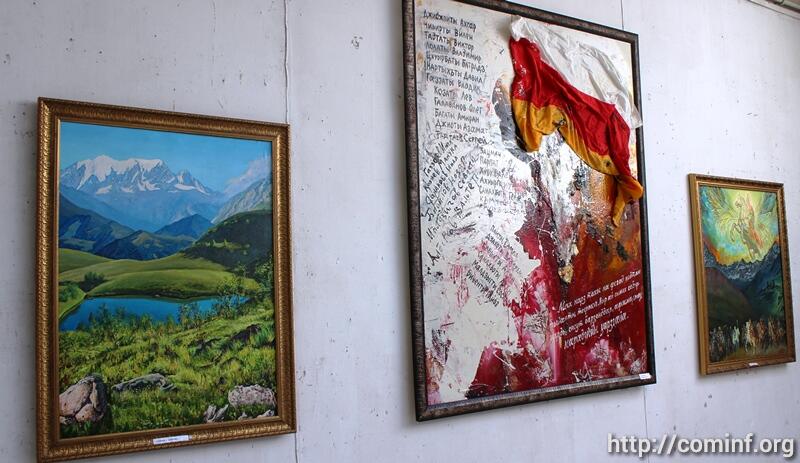 «Здесь представлены разные работы югоосетинских художников, которые посвящены Великой Отечественной войне, - сказал Цховребов. – Центральная картина выставки посвящена защитникам Южной Осетии с 1989 по 2008 годы. Картину написал академик, художник Ушанг Козаев, который вписал всех павших бойцов за годы грузинских агрессий, а это внуки и правнуки ветеранов, которые воевали в годы Великой Отечественной войны».