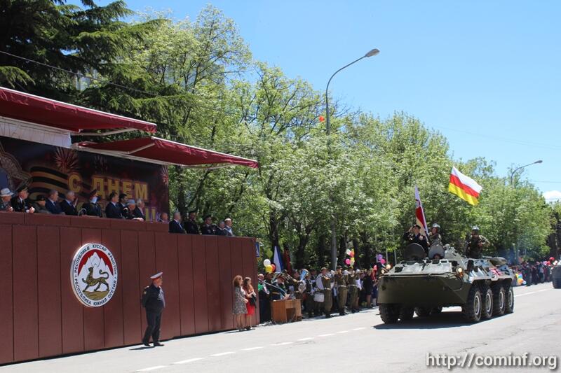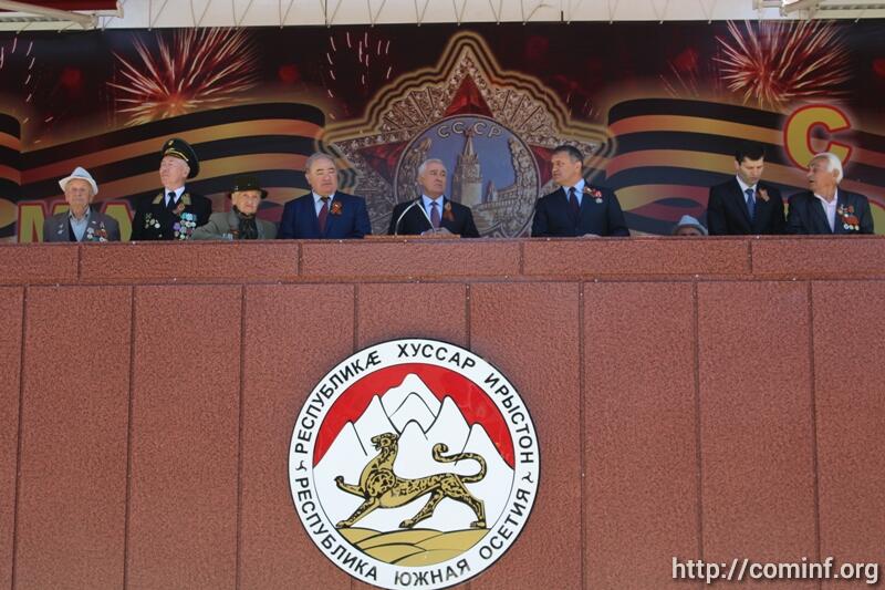 На параде присутствовали представители руководства Южной Осетии во главе с президентом Леонидом Тибиловым, Чрезвычайный и Полномочный посол РФ в РЮО Эльбрус Каргиев, руководители пограничного управления ФСБ России в Южной Осетии и военной базы №4, дислоцированной на территории Республики, ветераны Великой Отечественной войны, представители общественности.