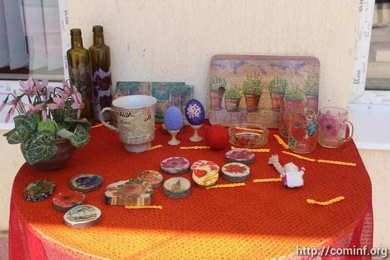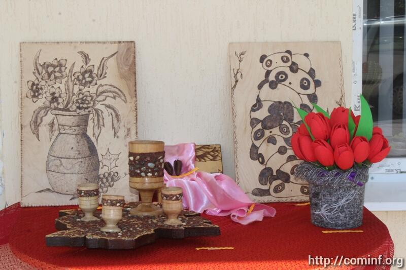 Кроме рисунков на выставке были представлены работы мастеров резьбы по дереву, поделки из бисера и другие.