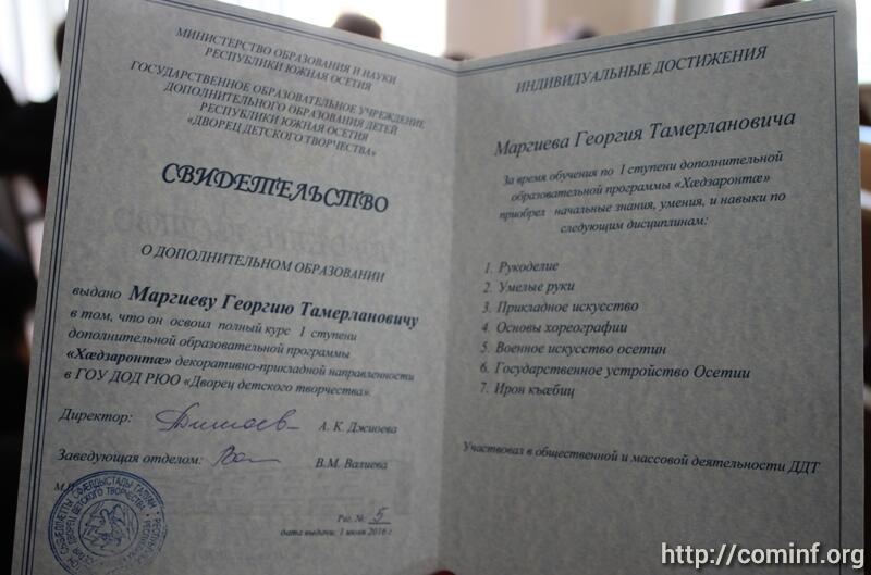 «Мы в первый раз провели тестирование для ребят, и они смогли очень успешно ответить на все вопросы, которые были перед ними поставлены, - подчеркнула Джиоева.- В первый раз мы выдаем свидетельства, утвержденные Министерством образования и науки, и мы надеемся, что для вас, для Дворца и для всех детей, это станет гарантом больших успехов в дальнейшем».