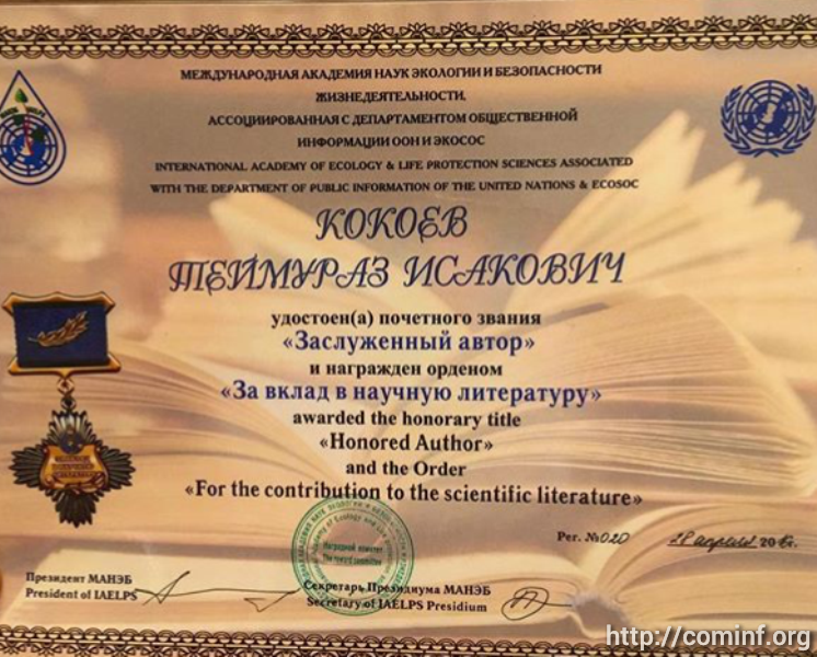 Как рассказал ИА «Рес» Теймураз Кокоев вручение наград состоялось первого июля на заседании Северо-Кавказского регионального отделения МАНЭБ во Владикавказе.