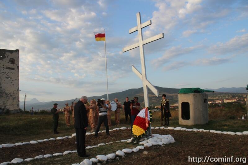 В Цхинвале сегодня состоялось возложение венков и цветов к Поклонному кресту у здания, где до 2008 года располагался российский миротворческий контингент Смешанных сил по поддержанию мира.