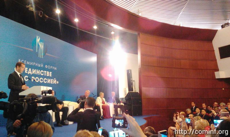 Долгожданным моментом для участников форума стало выступление председателя правительства России Дмитрия Медведева, который отметил, что соотечественников нельзя разделить границами с Российской Федерацией.