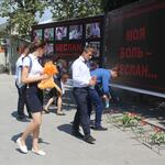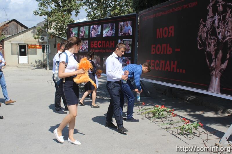 Сотни школьников пришли с цветами, игрушками и бутылками воды на Сборную площадь. Под звуки траурной музыки присутствующие отдали дань памяти детям Беслана.