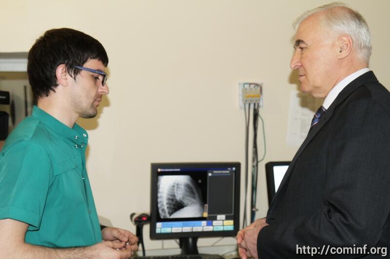 В кабинете рентгенодиагностики и флюорографии Леонид Тибилов пообщался с молодыми специалистами, которые уже второй год работают на новом оборудовании. По словам врача Георгия Шавлохова, данное оборудование является одним из лучших на Северном Кавказе, было закуплено всего несколько лет назад.